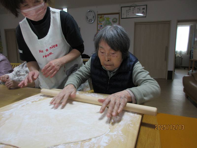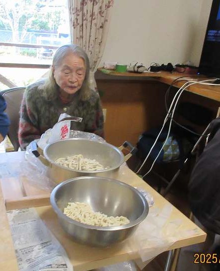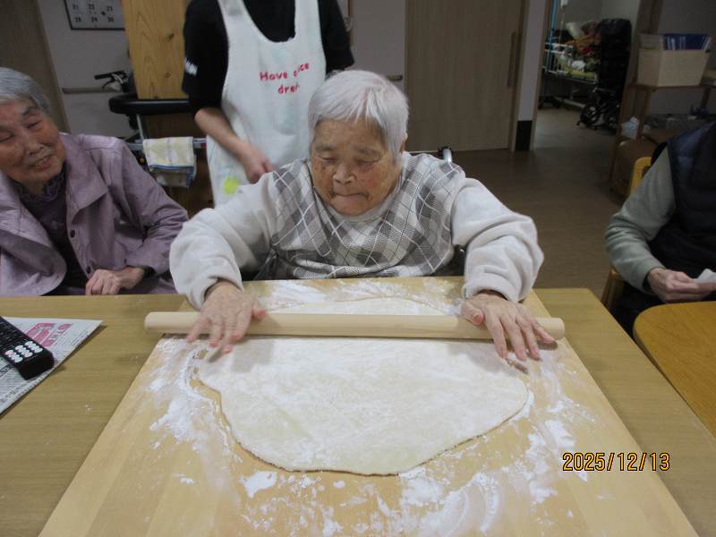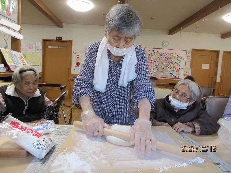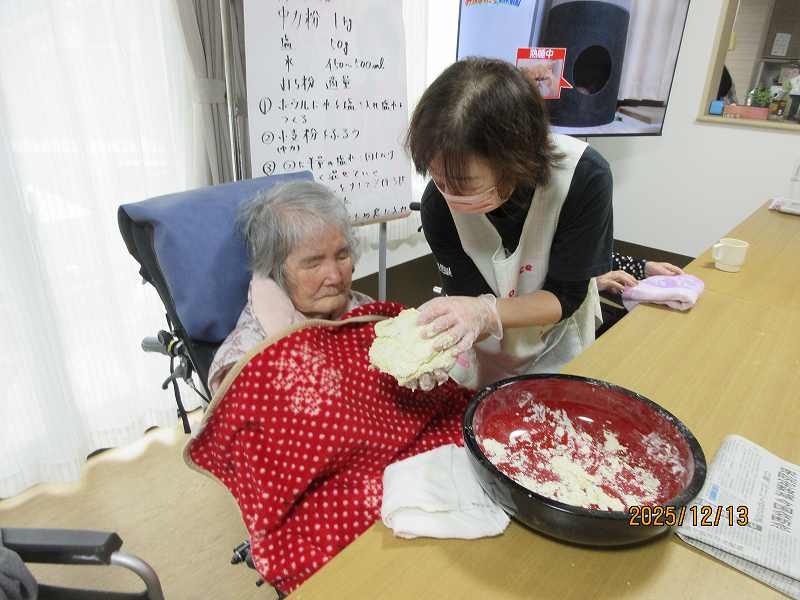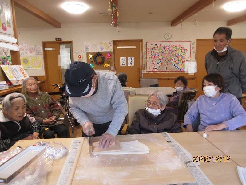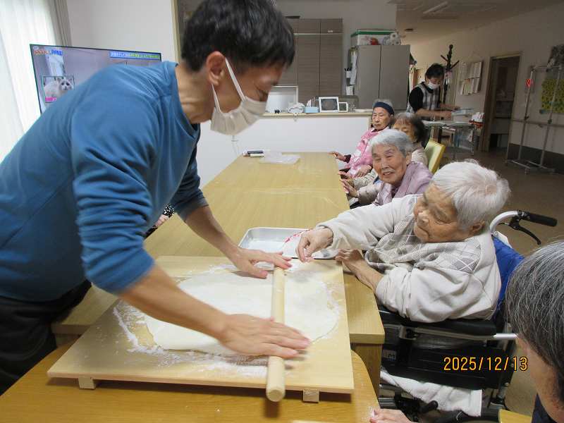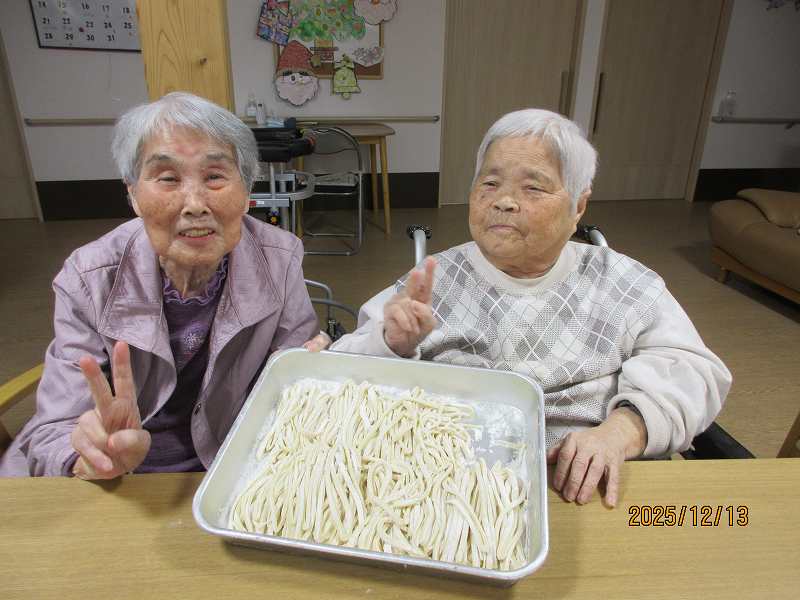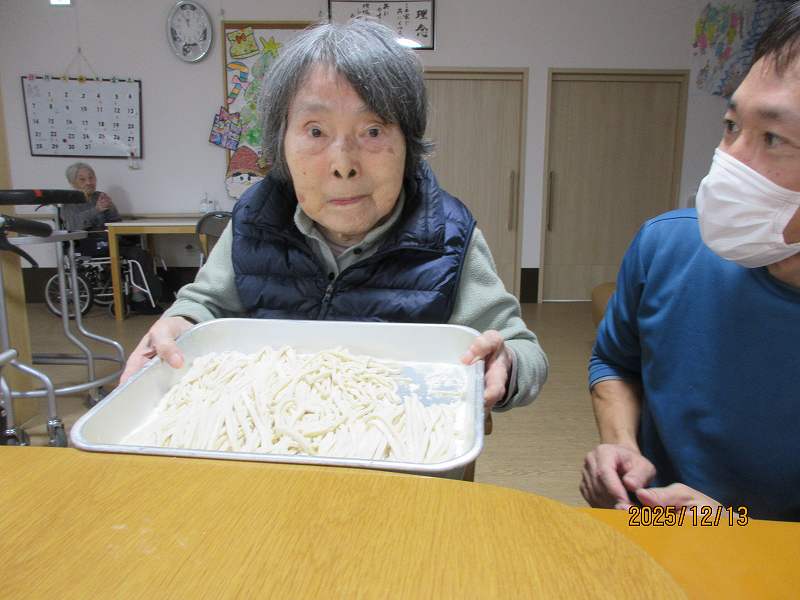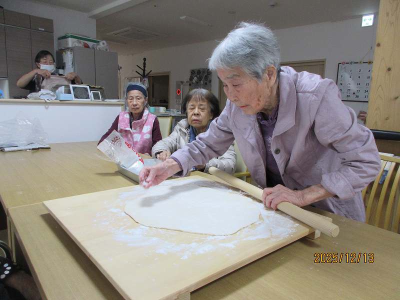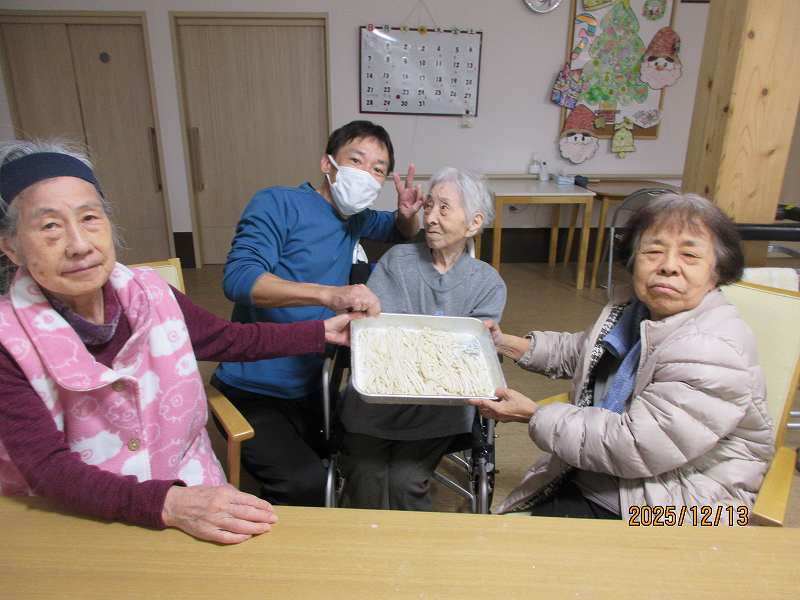 デイサービス・グループホームそれぞれでうどん作りを開催しました♪初めてうどん作りをされる方も多く、楽しまれていました😊