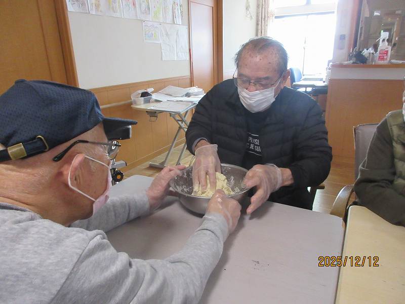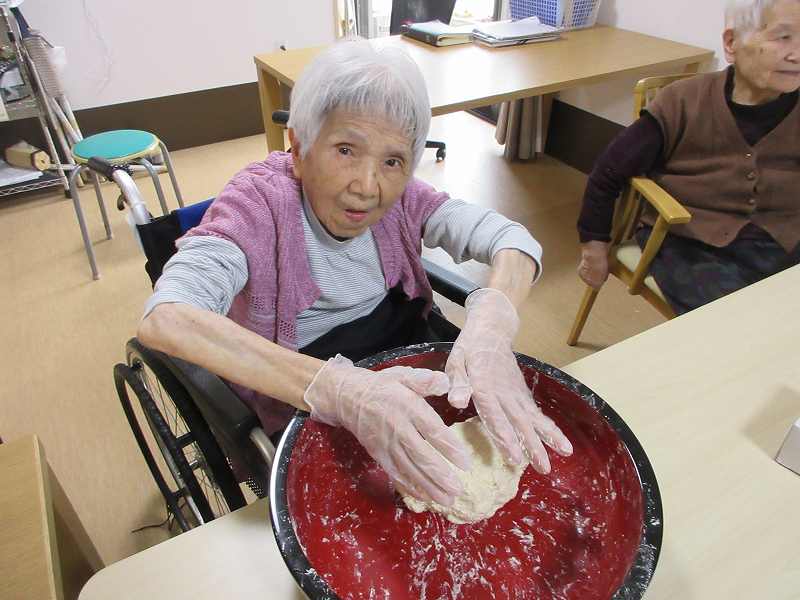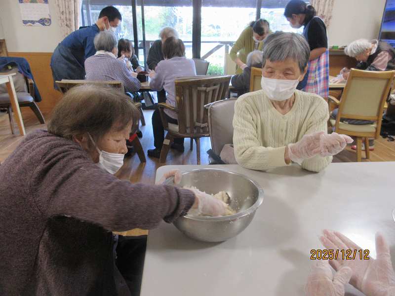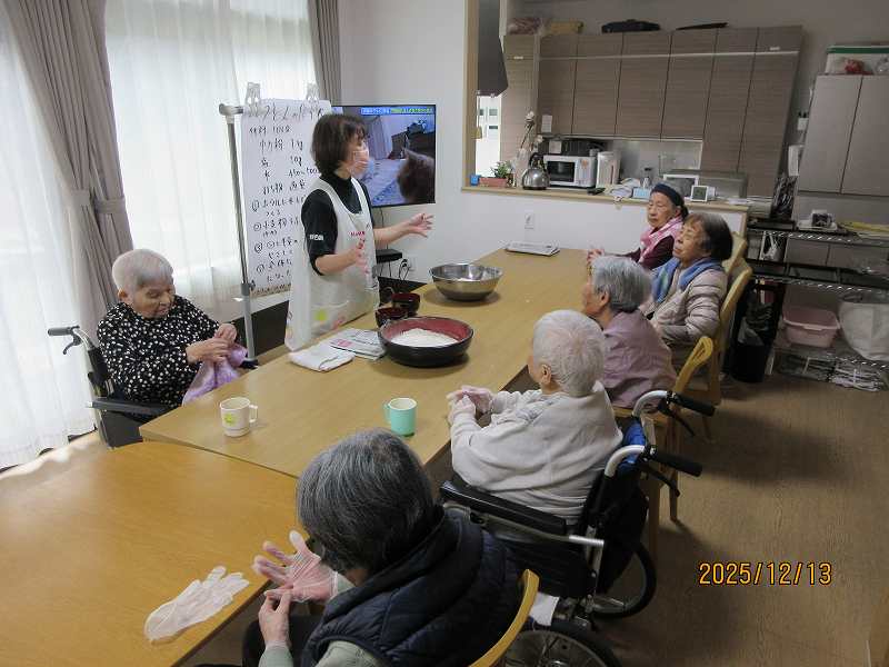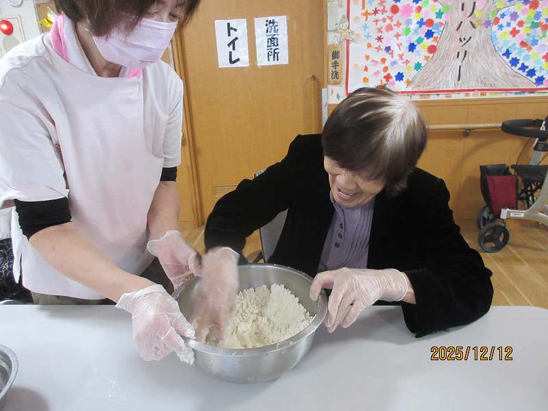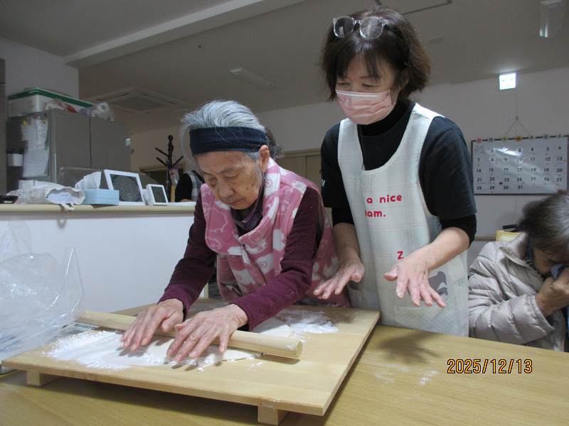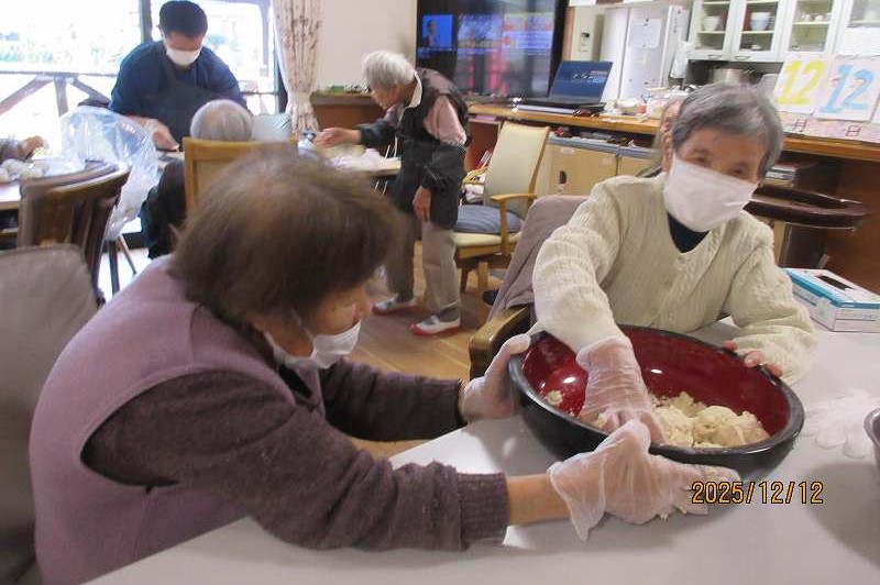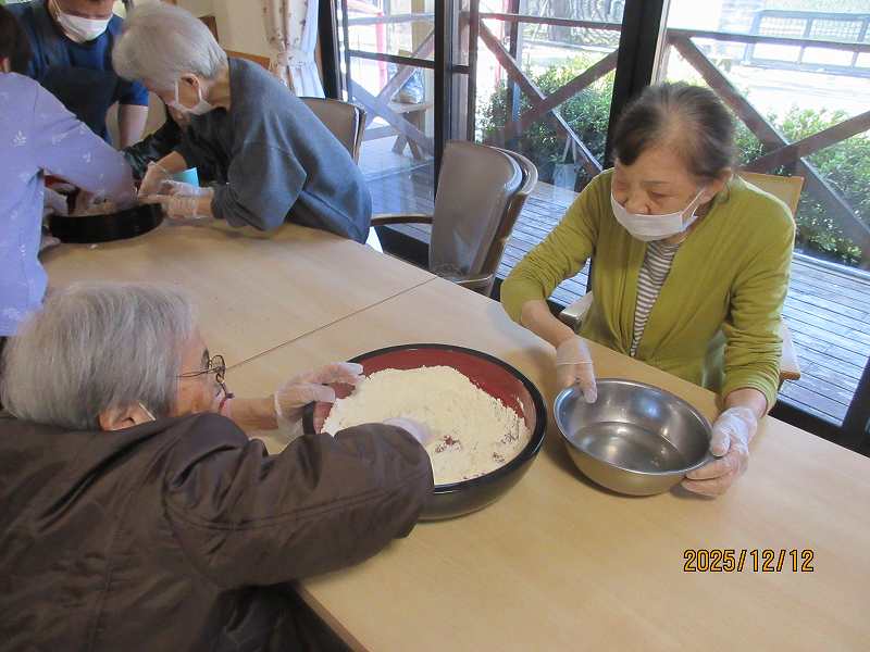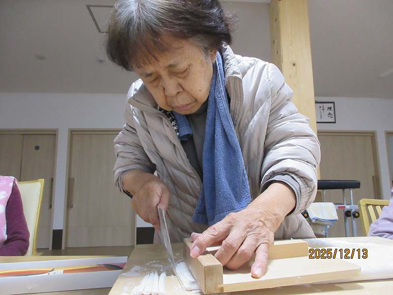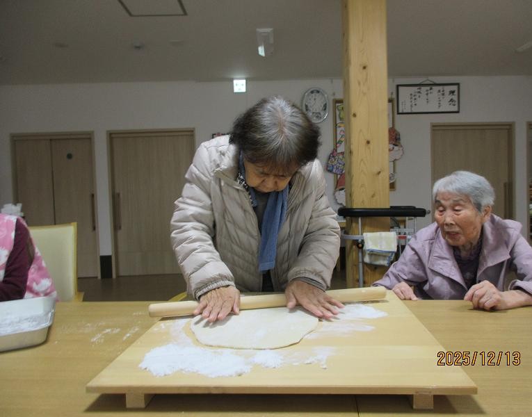 デイサービス・グループホームそれぞれでうどん作りを開催しました♪初めてうどん作りをされる方も多く、楽しまれていました😊