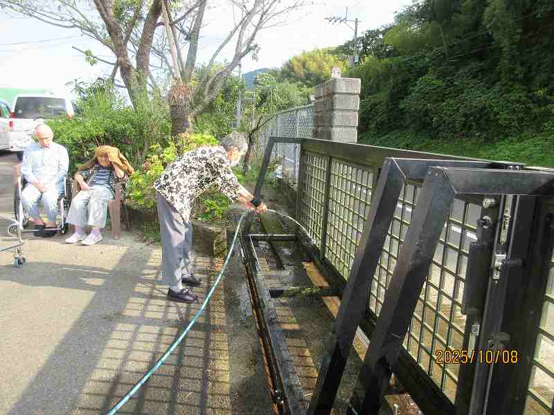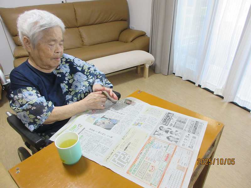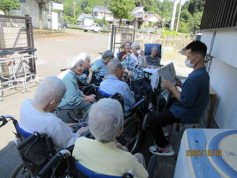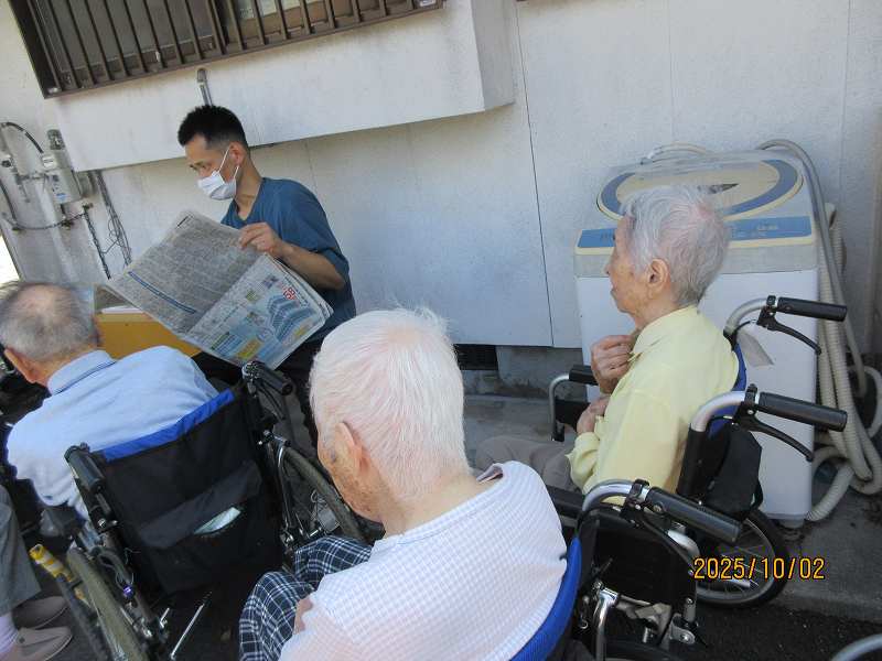 お外でお茶を飲みながら新聞読みに耳を傾けておられました😊