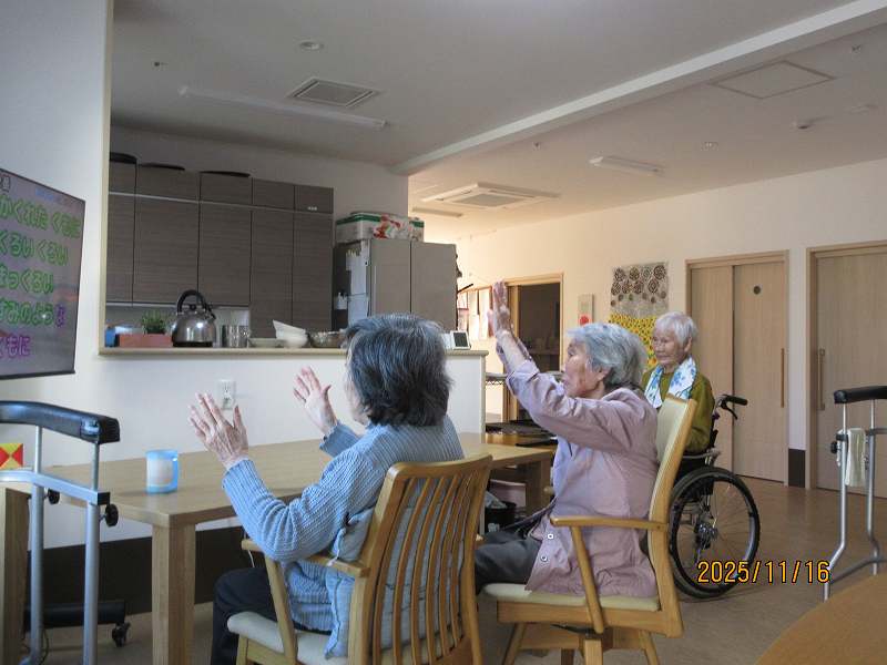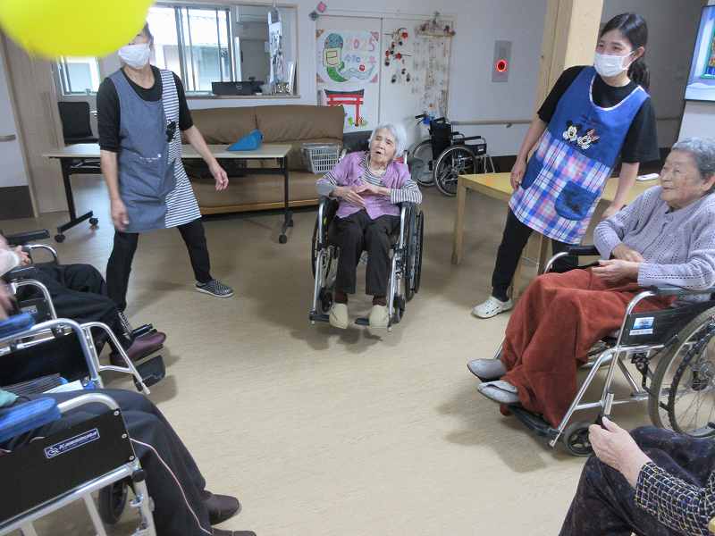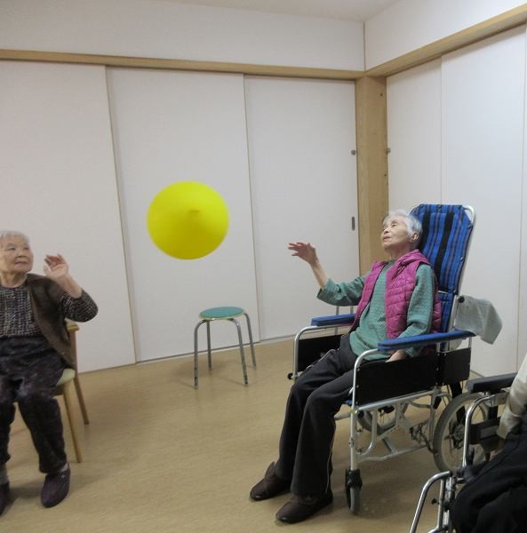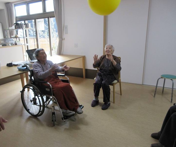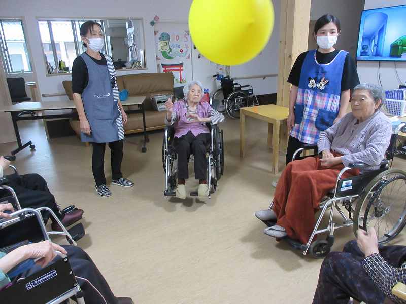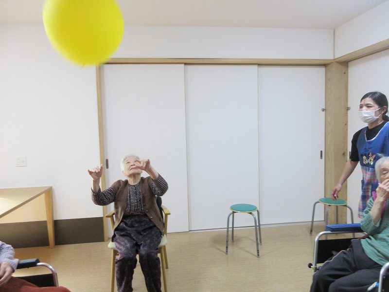 グループホーム🌸日常風景 輪になって風船バレー🎈上手く打ち返すと拍手👏失敗しても笑いが溢れ盛り上がっていました😊