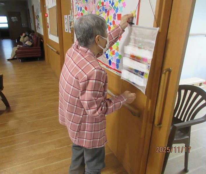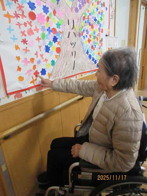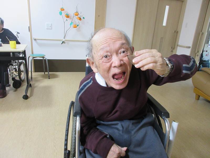 グループホーム🌸日常風景 折り紙で作った柿を本物の枝に飾り付けてみました♪本当の柿みたいです🍅🍅🍅