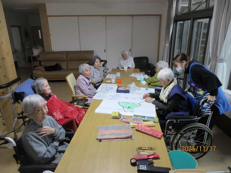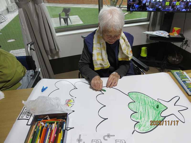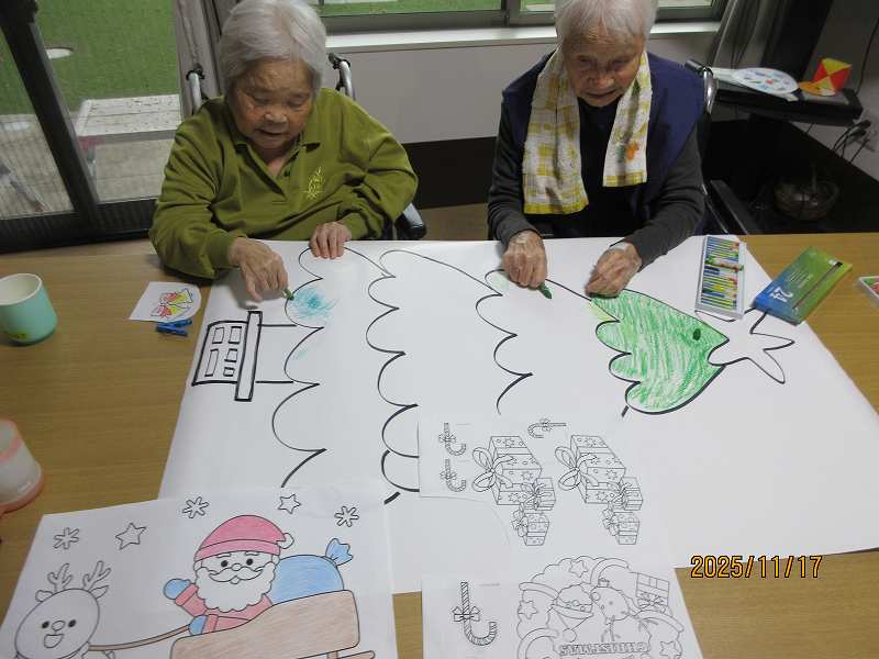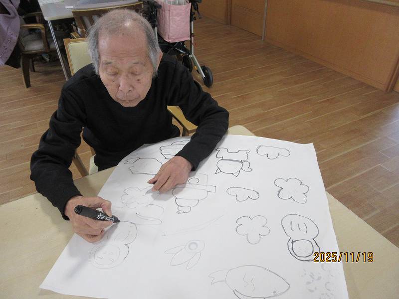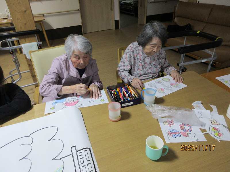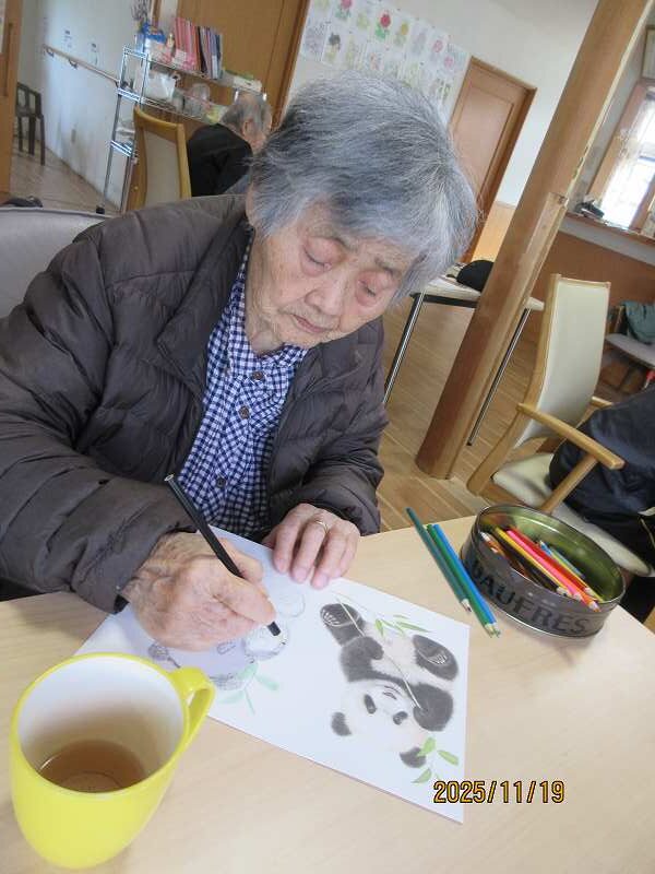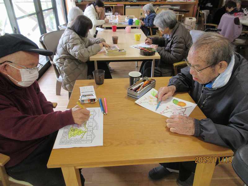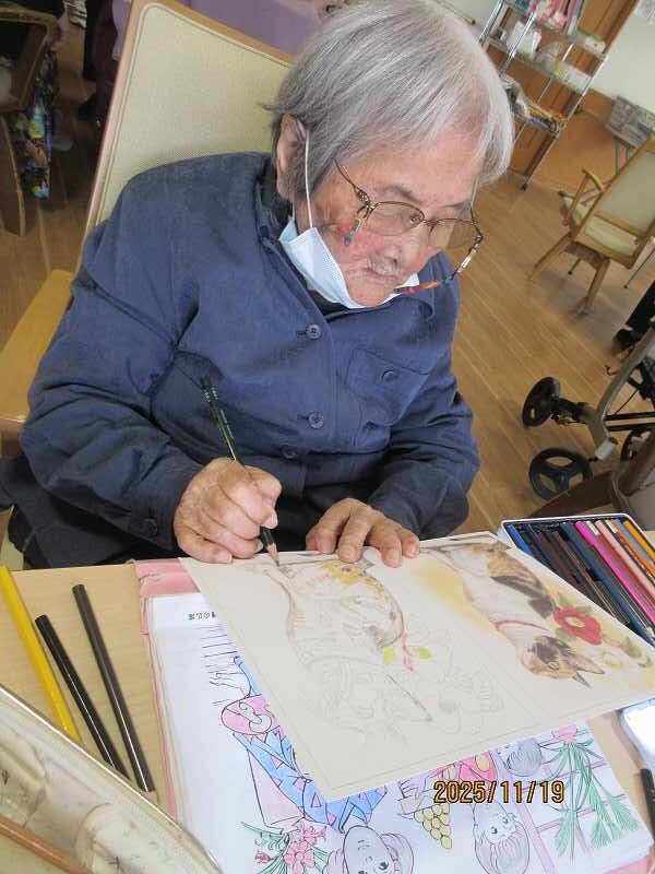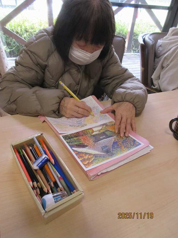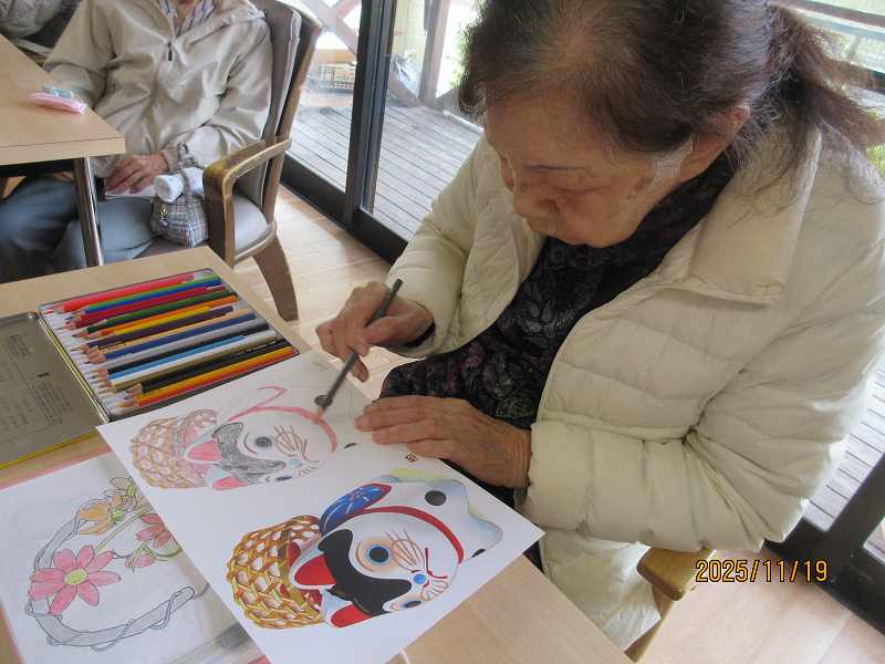 デイサービース🌸日常風景 芸術の秋🍁色塗りに熱心に取り組まれていました♪筆圧を変えたりとても綺麗に塗られていました✨