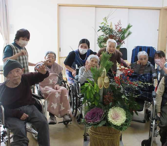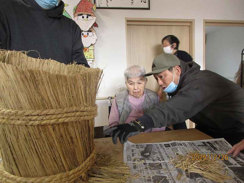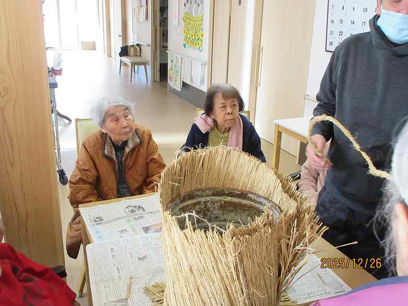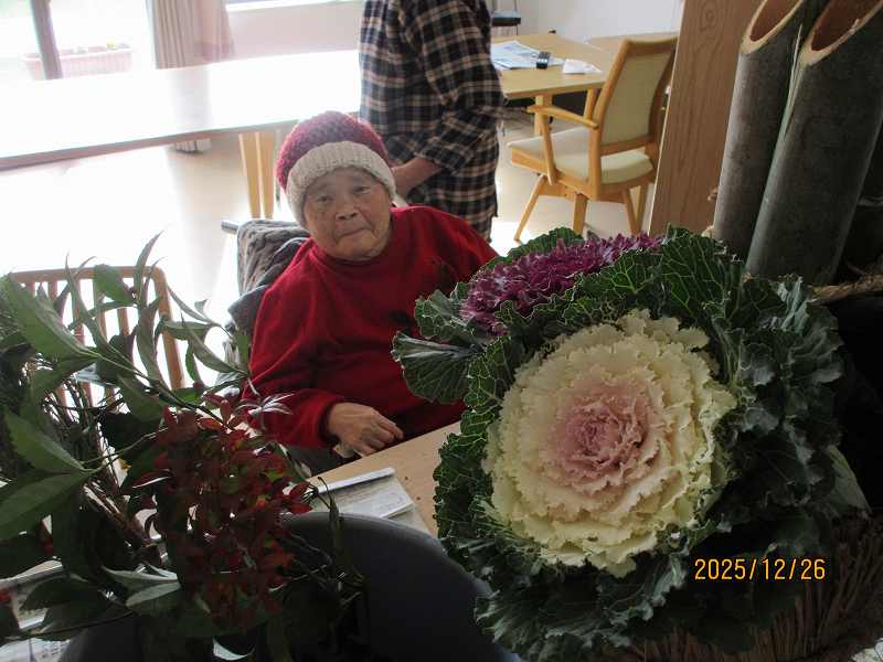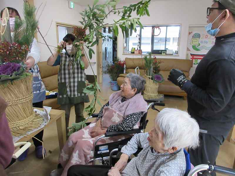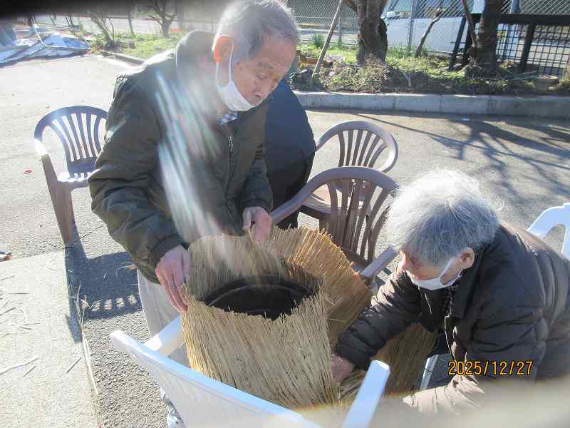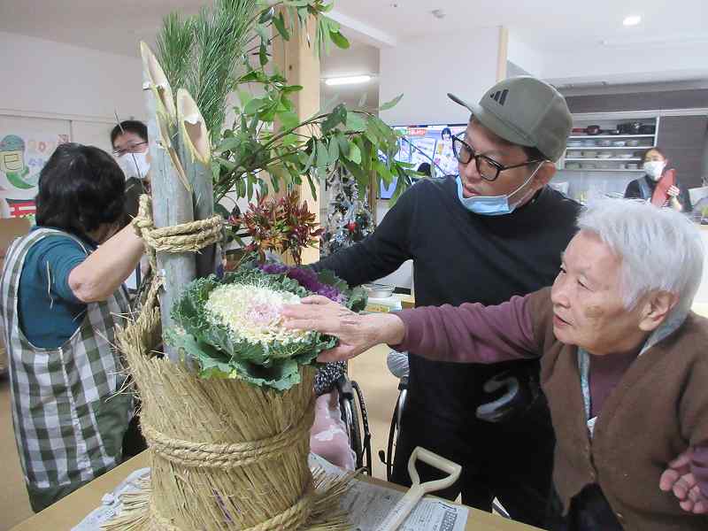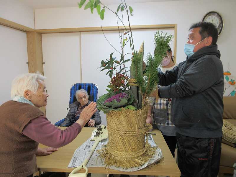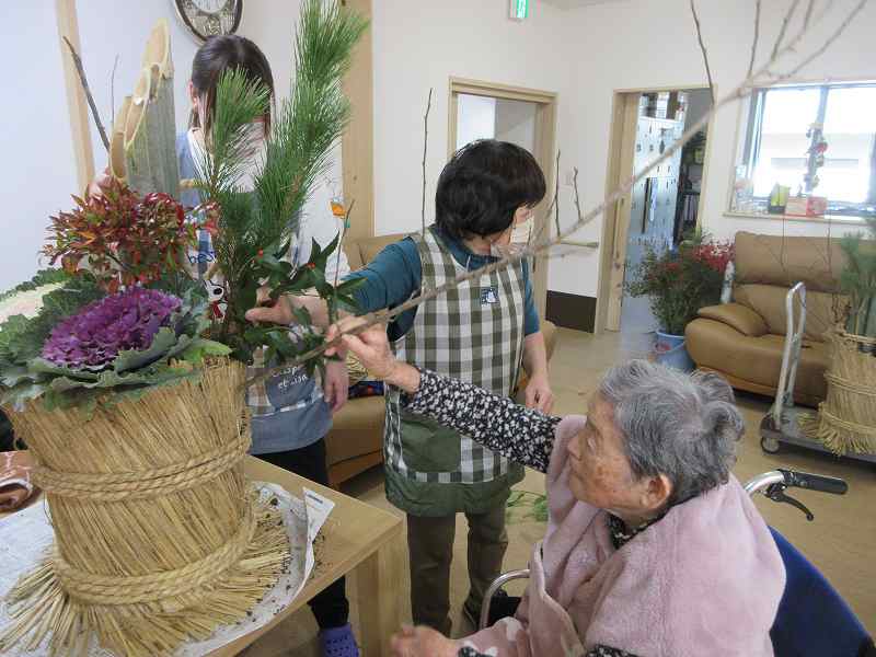 土台に藁を巻き、松・竹・南天・葉牡丹など入居者様と一緒に飾りつけを行いました♪