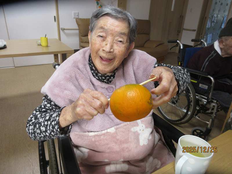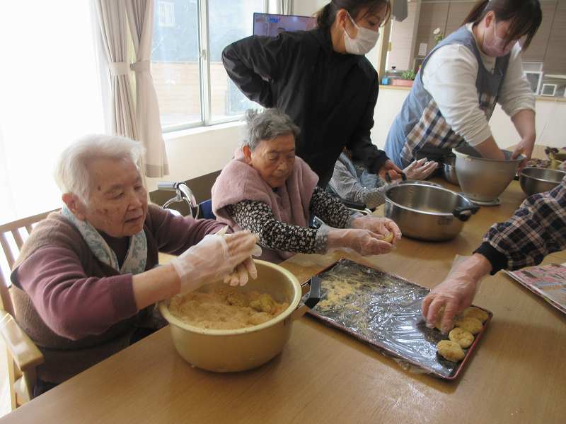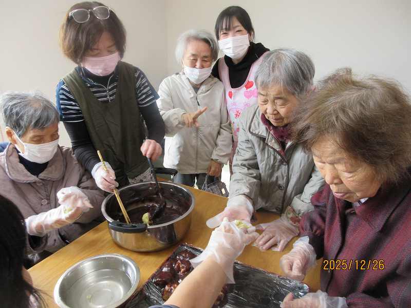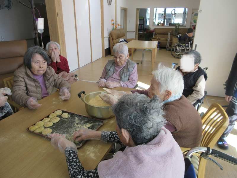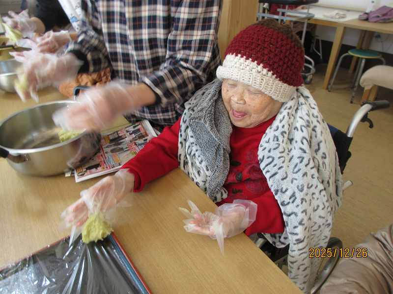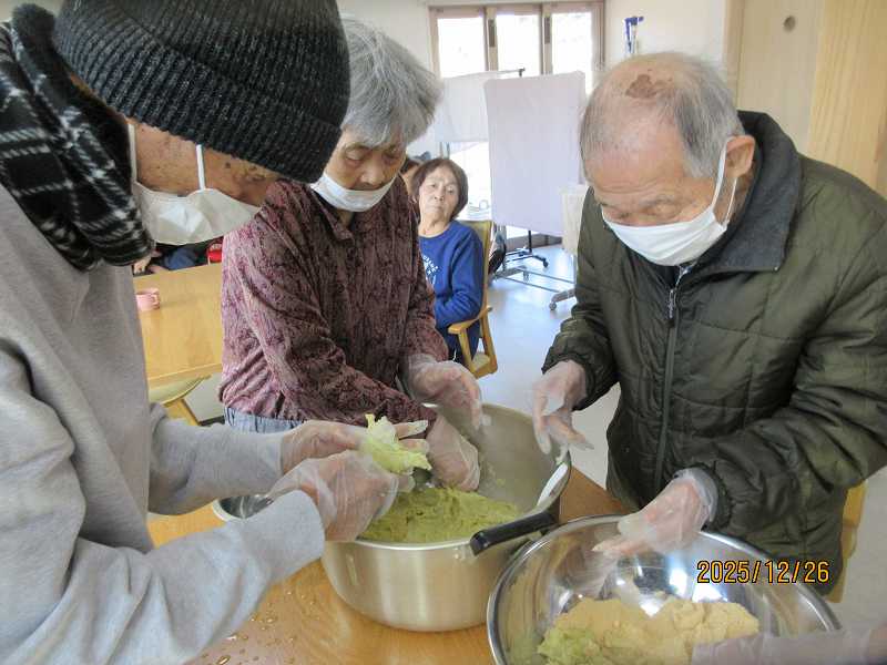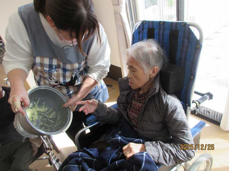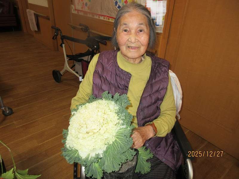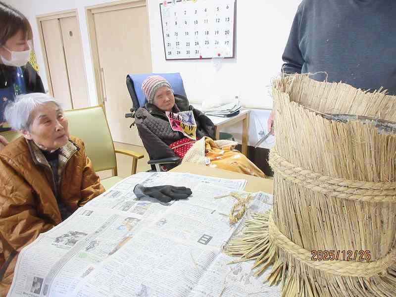 土台に藁を巻き、松・竹・南天・葉牡丹など入居者様と一緒に飾りつけを行いました♪