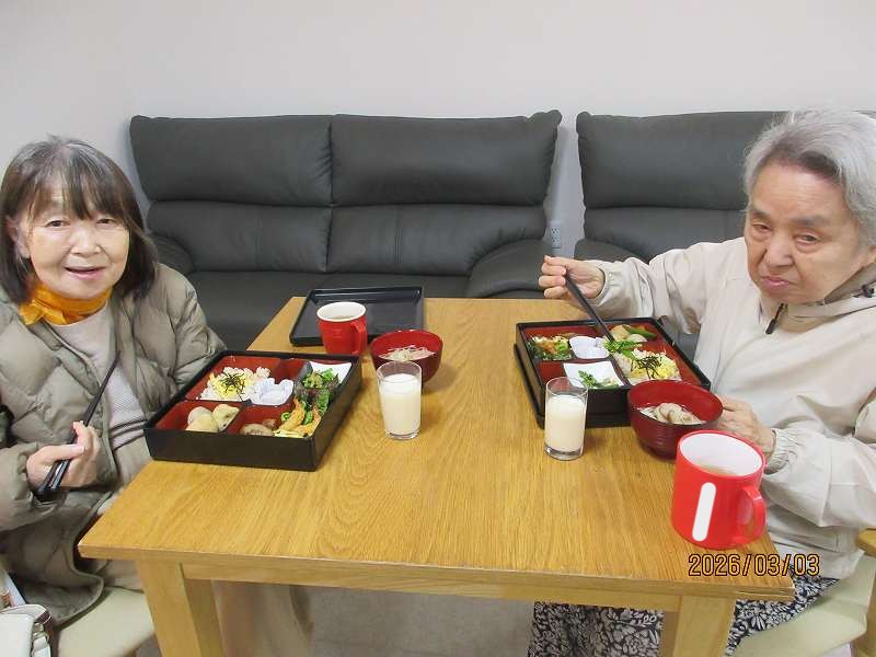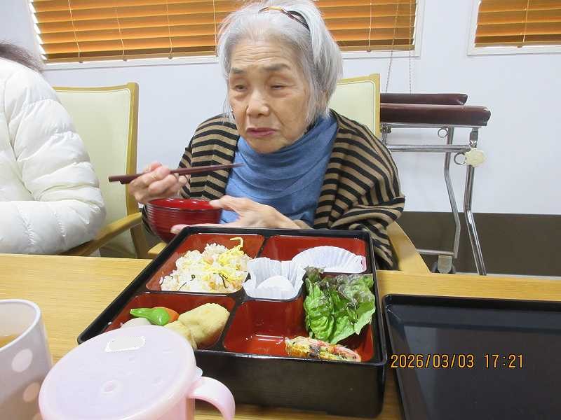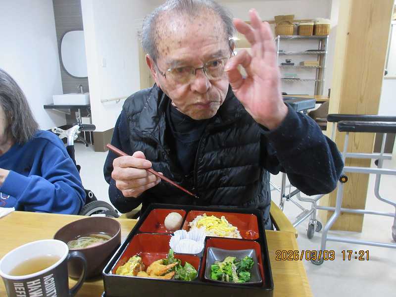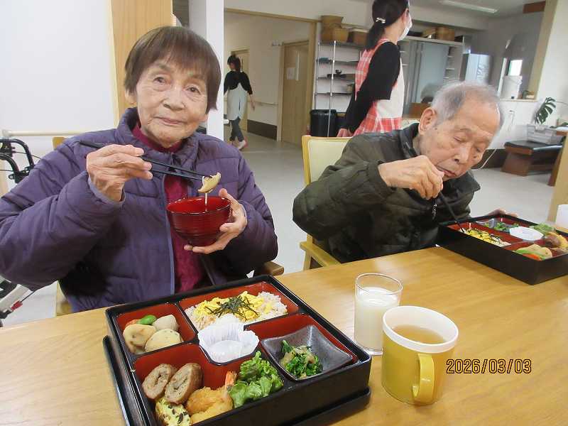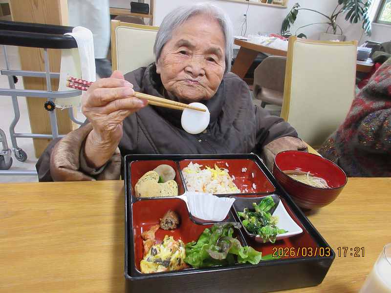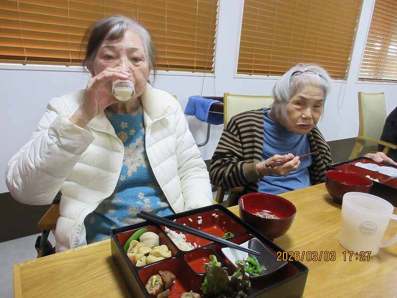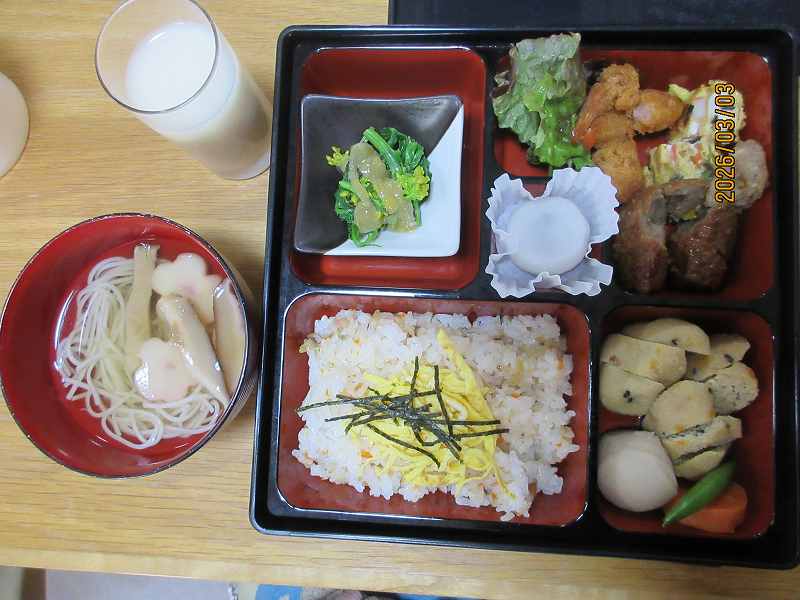 夜はひな祭りメニュー✨有料老人ホームではお重で提供しました♪一段と雰囲気がでていますね😊甘酒もいっしょに♪