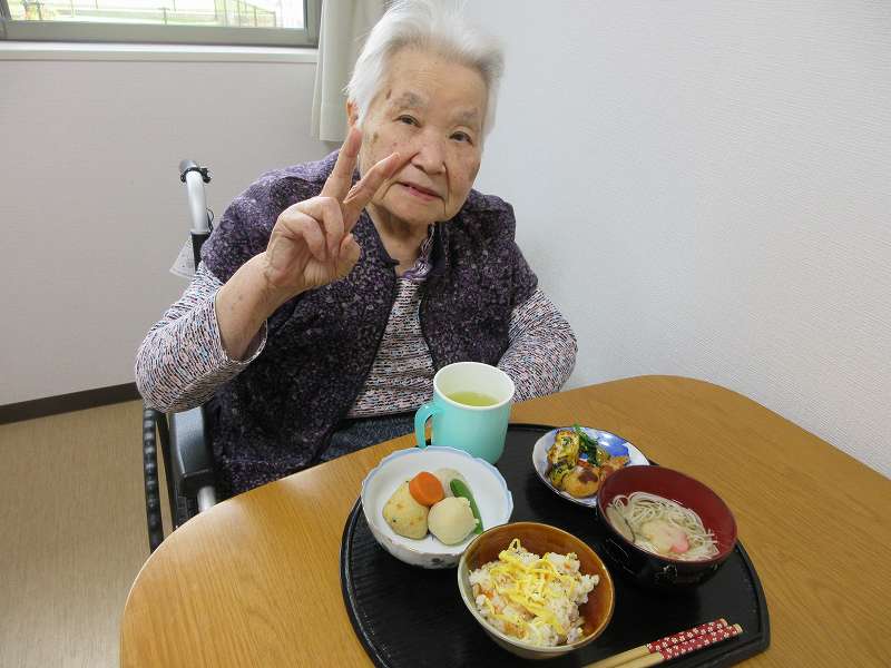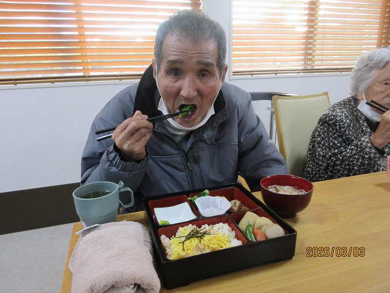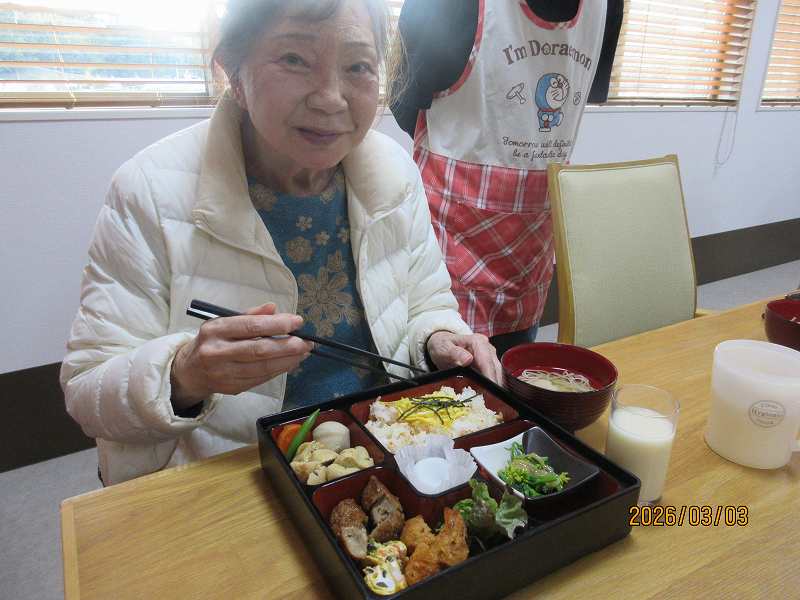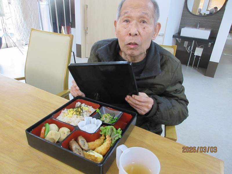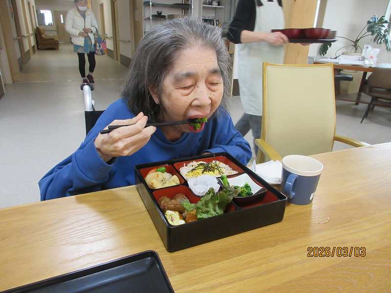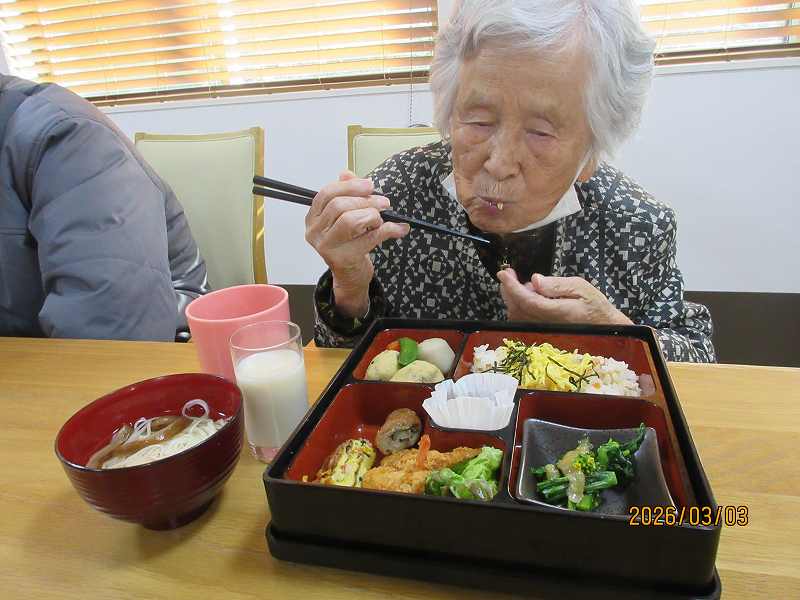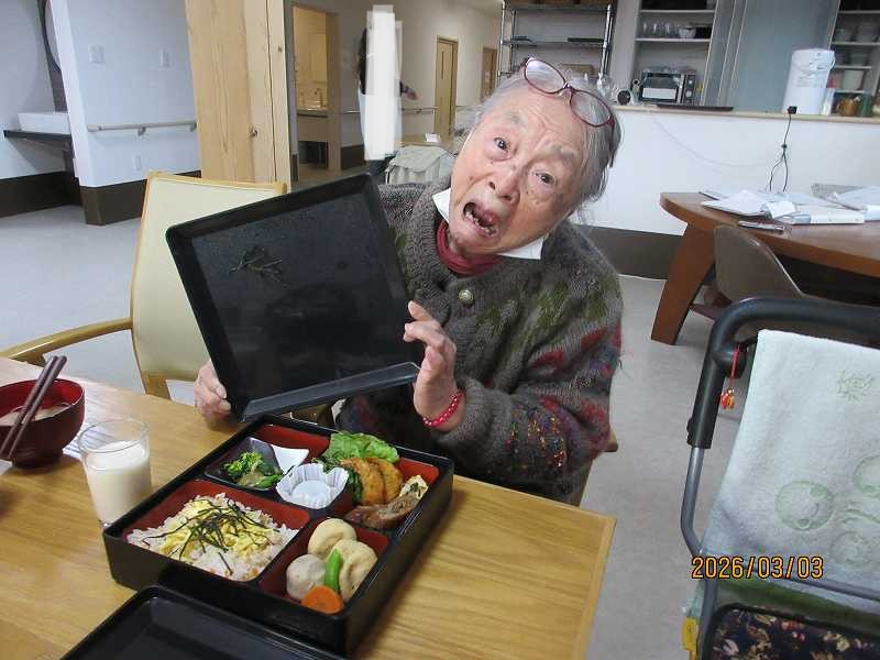 夜はひな祭りメニュー✨有料老人ホームではお重で提供しました♪一段と雰囲気がでていますね😊甘酒もいっしょに♪