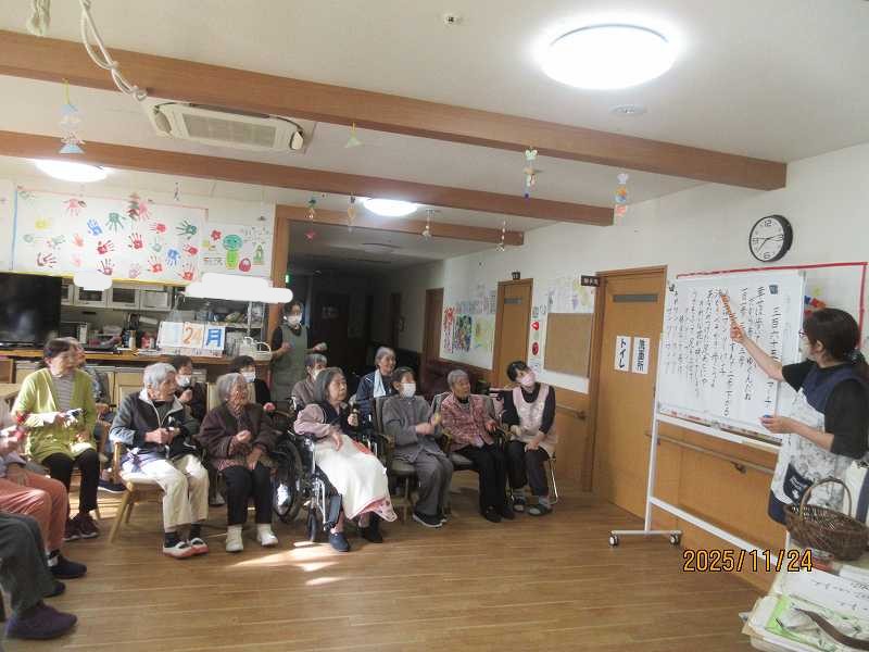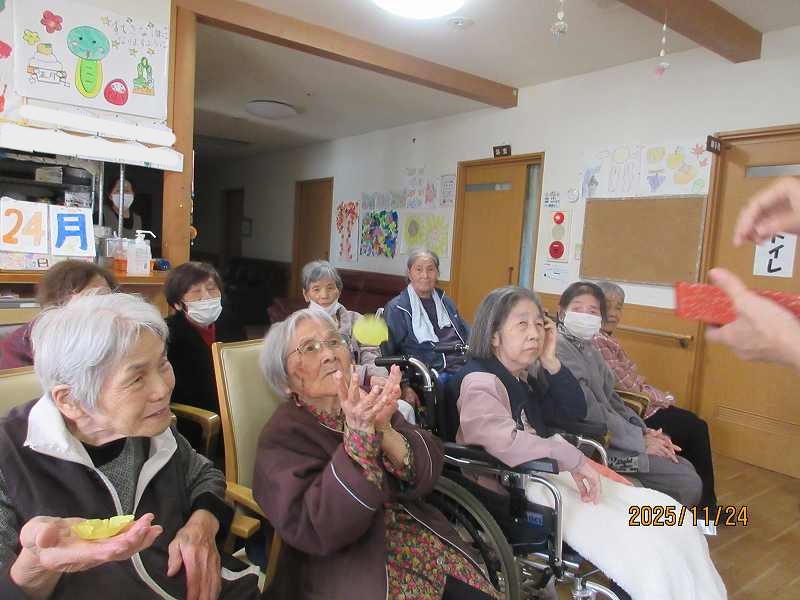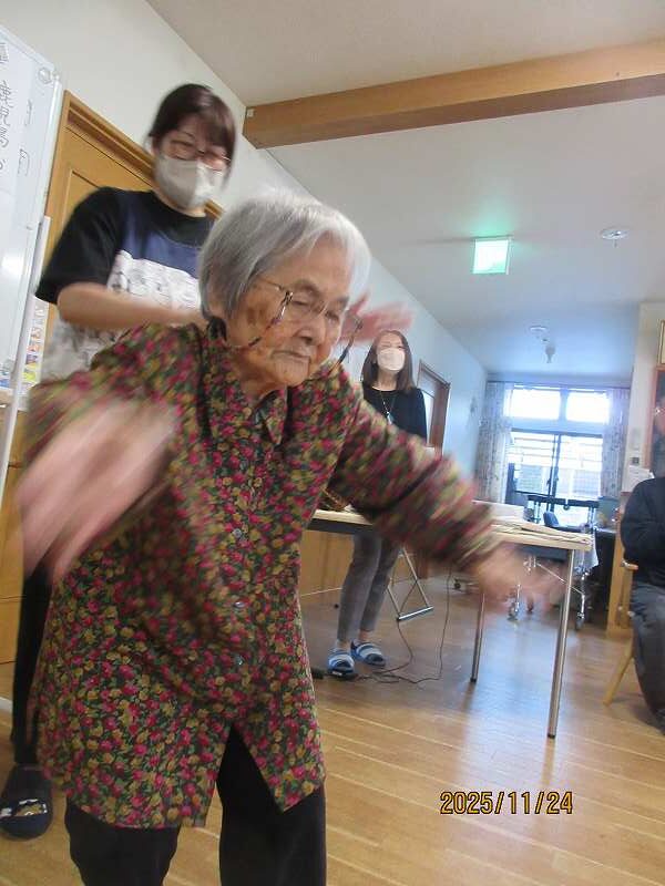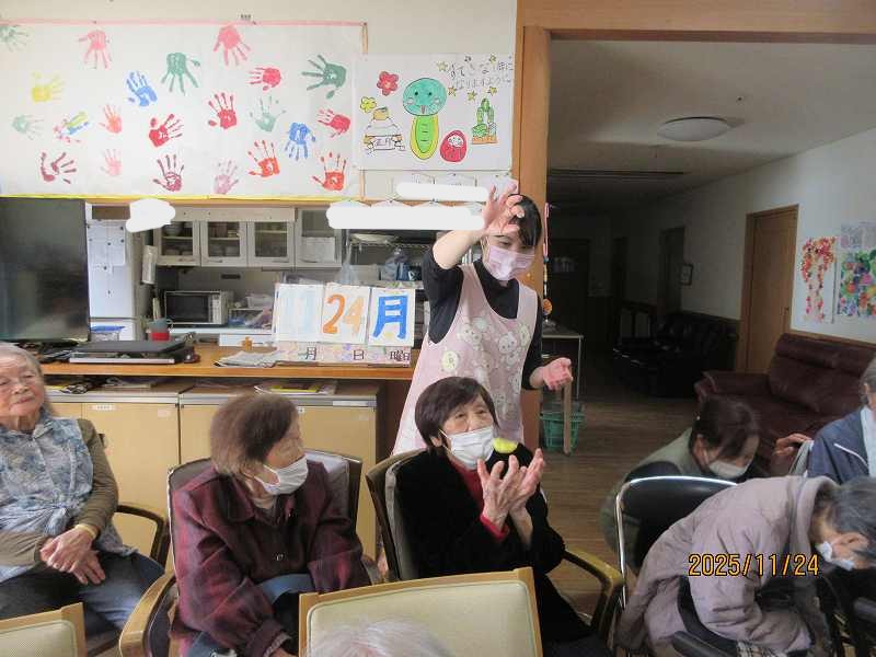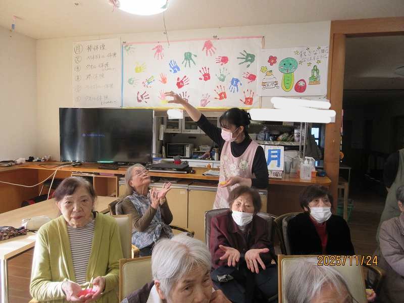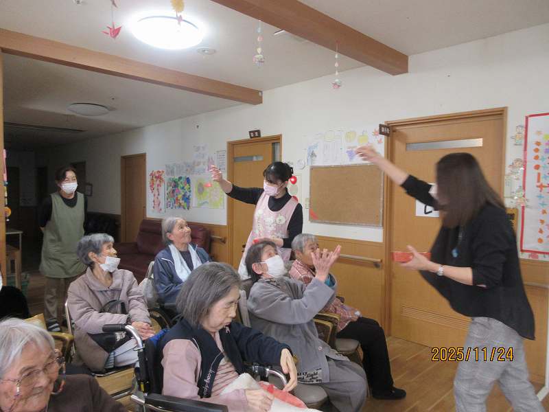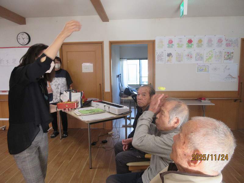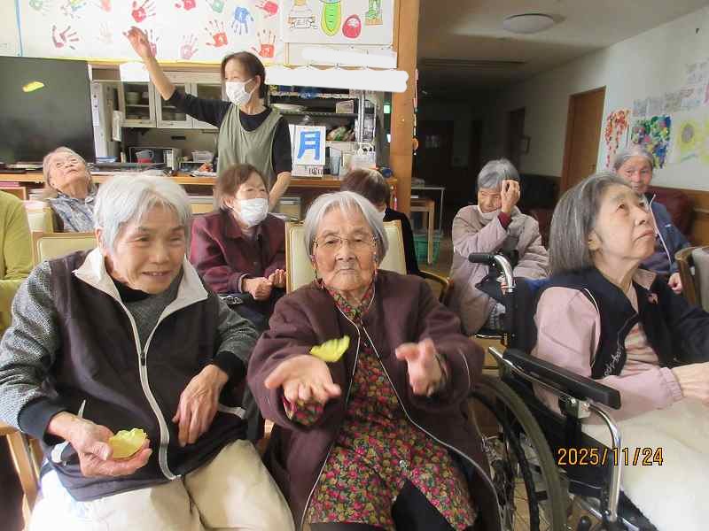 イチョウ・もみじに見立てか紙をキャッチ♪ヒラヒラと舞う葉をみなさん一生懸命目で追い頑張っておられました😊