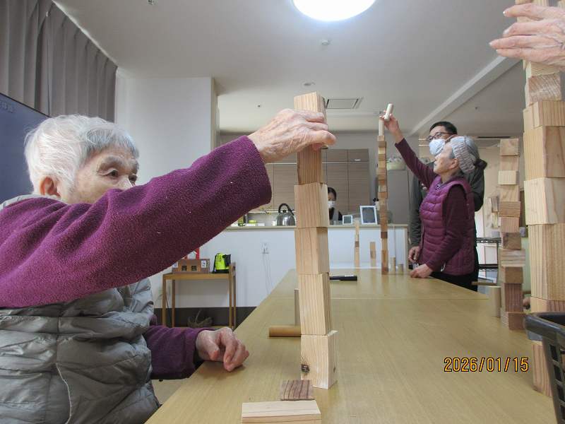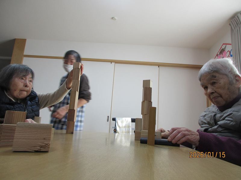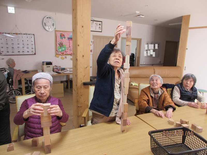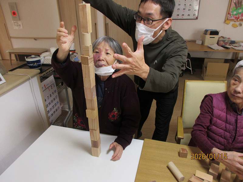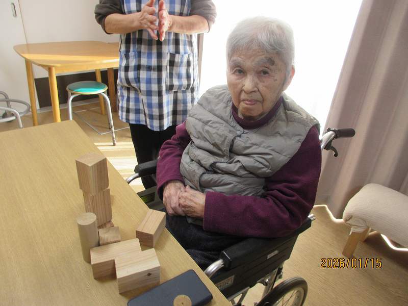 積み木つみ♪真剣に集中してご自身の身長より高く積み上げておられました😊積み木の大きさ、形を吟味し置き方も工夫しておられました♪