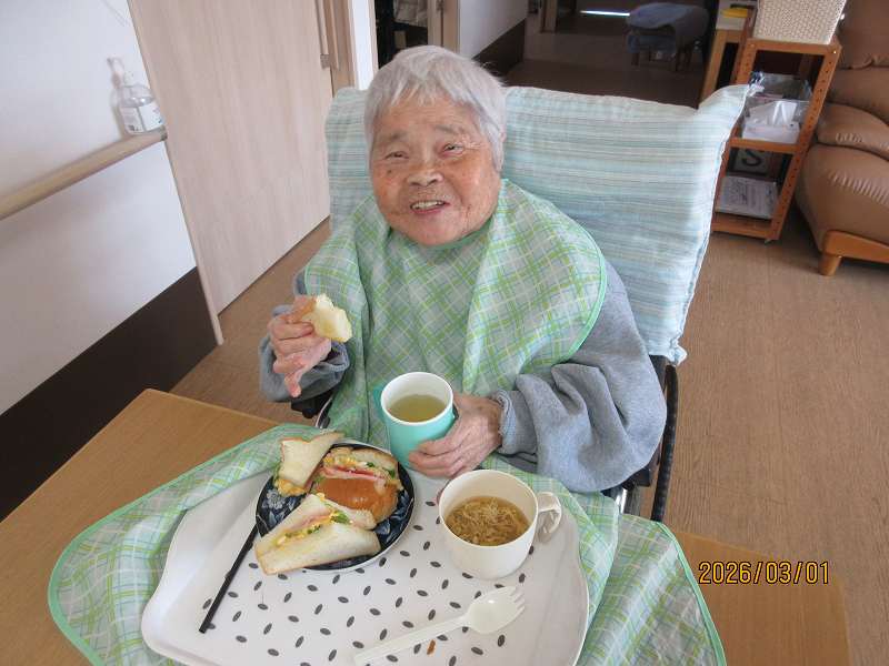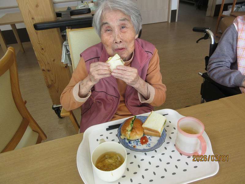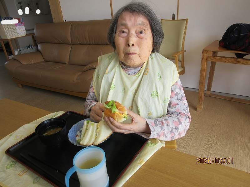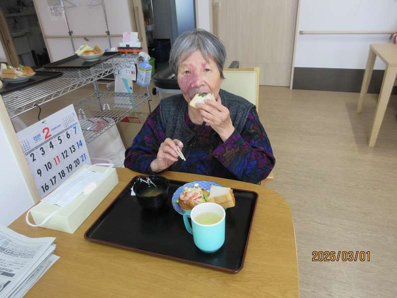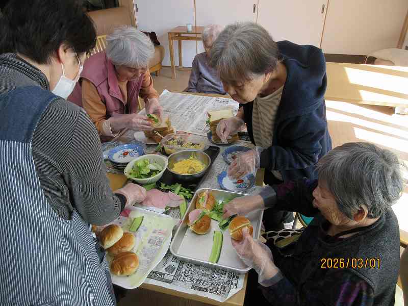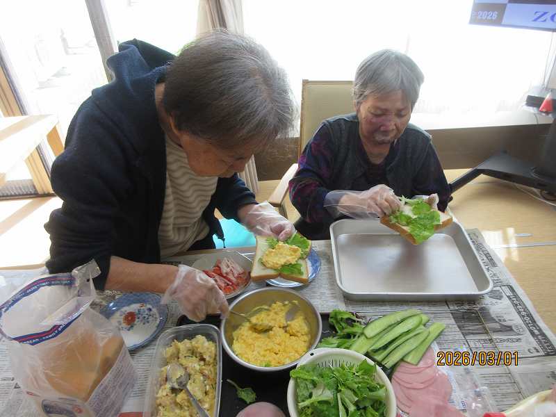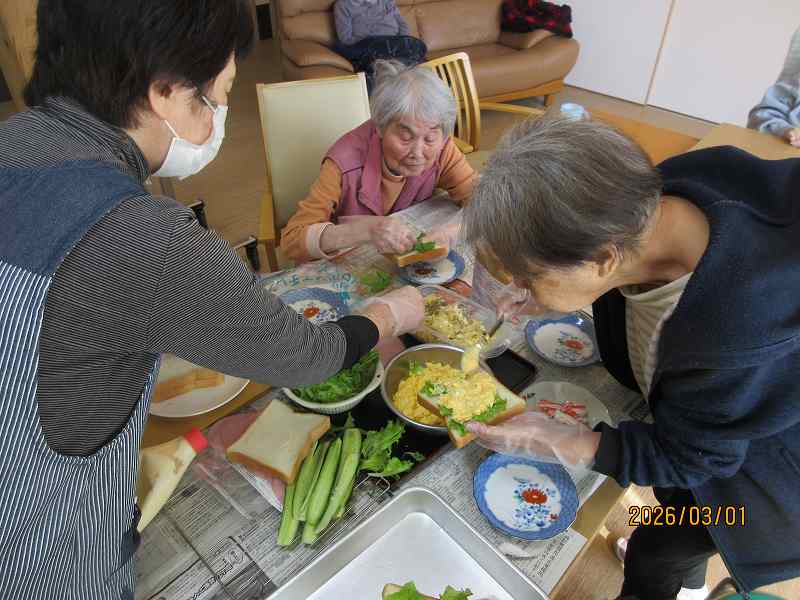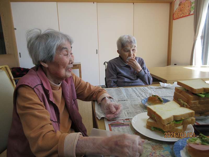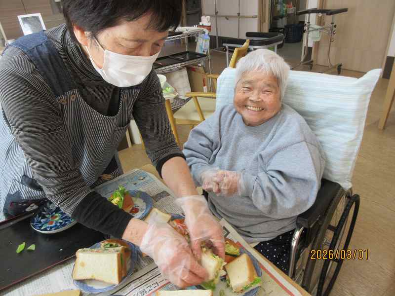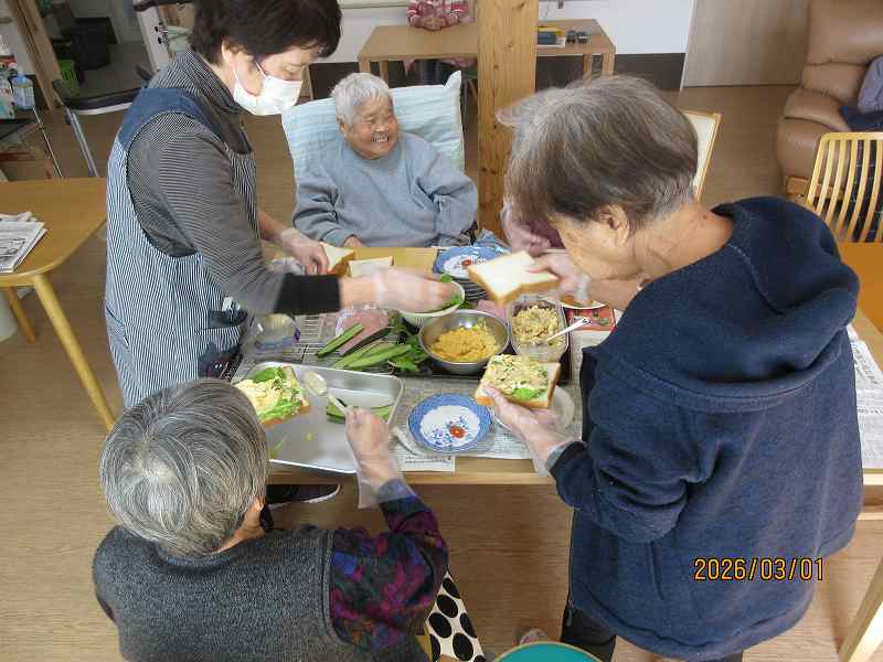 グループホーム🌸日常風景 お昼はサンドウィッチ♪お好きな具材をそれぞれ選んでサンド✨作っている最中から「美味しそうだね~」と目を輝かせておられました😊