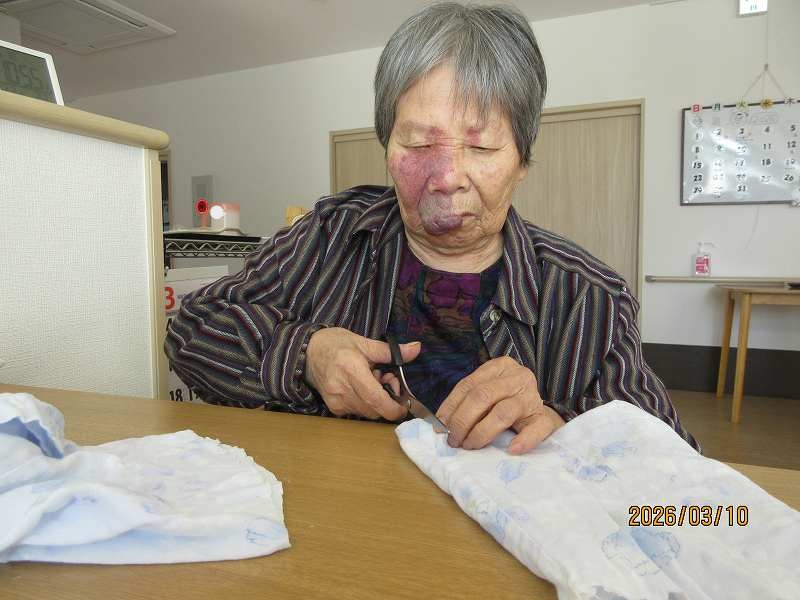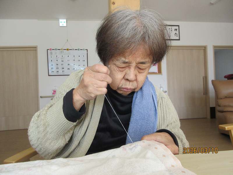 グループホーム🌸日常風景 雑巾縫い🪡集中して作業され、時間がきても「ここまで縫うから!!」と最後まで仕上げて下さいました😊