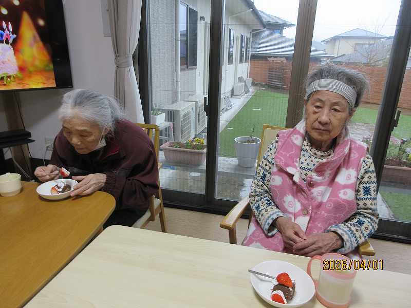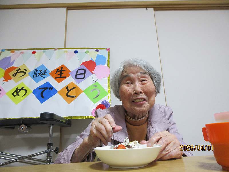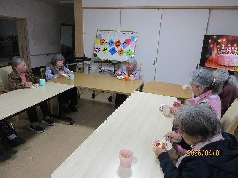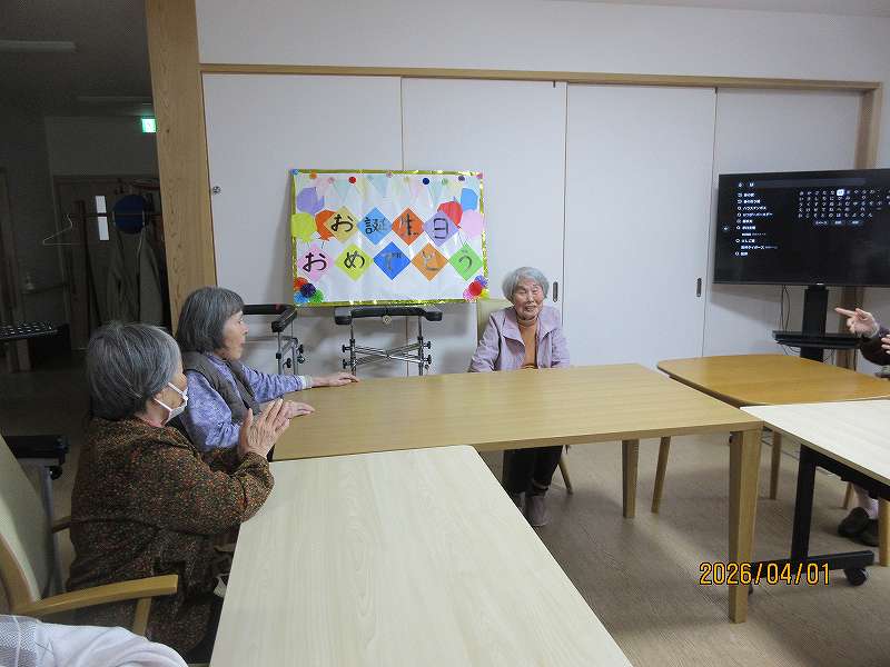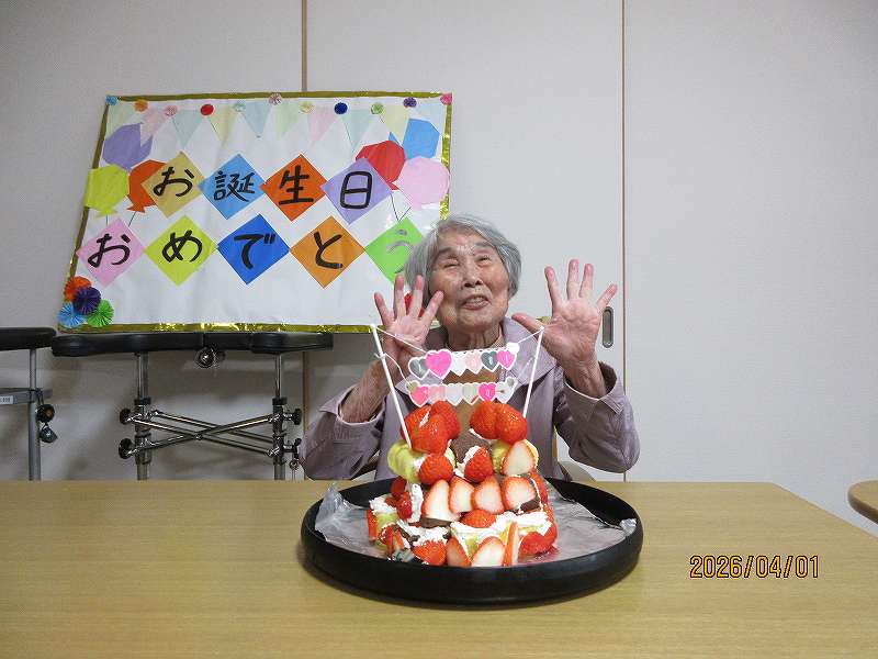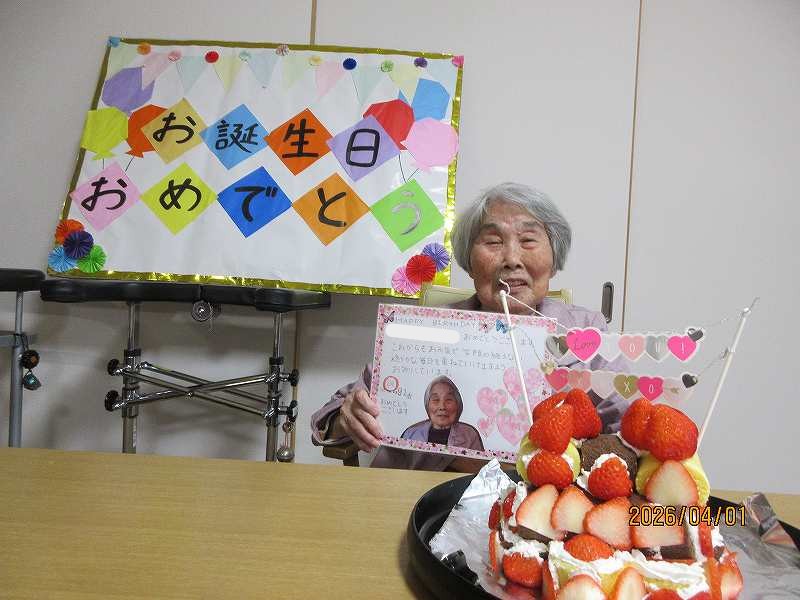 4月1日 🎂お誕生日おめでとうございます♪新た一年が穏やかで笑顔いっぱいの日々になりますように✨ 公開済み: 2026年4月1日更新: 2026年4月1日作成者: さくらの里カテゴリー: イベント 本日の主役🎉 お昼はお祝いメニューでした✨ みんなで歌を唄いお祝い✨嬉しそうでした♪ バースディケーキ🎂「おいしい~」喜んで下さいました♪ これからも健康でたくさんの思い出を一緒に作っていきましょう♪ 関連記事 🎹6月14日 グループホームにて音楽療法が行われました♪今回も季節の音楽やおなじみの曲など皆さん楽しく参加されていました♪ 公開済み: 2025年6月15日更新: 2025年6月15日作成者: さくらの里カテゴリー: イベント 11/16、19 しょうよう君・りおちゃん 今日もパワーを頂きました。みんなを笑顔に😊 また遊びに来てね😊 公開済み: 2022年11月20日更新: 2022年11月30日作成者: さくらの里カテゴリー: イベント 10月🎹音楽療法🎵 坂中先生が奏でるピアノに合わせ歌を唄い♪楽器を奏で🪇楽しい時間を過ごすことができました😊皆さん大きな声で歌をうたわれたり手拍子をされていました✨ 公開済み: 2024年10月25日更新: 2024年10月28日作成者: さくらの里カテゴリー: イベント